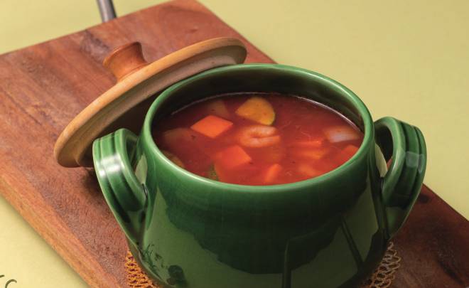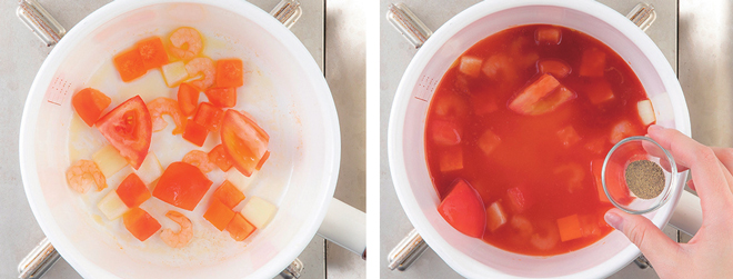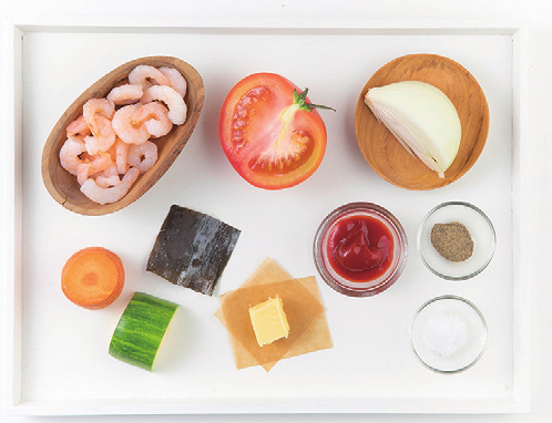 새우살 30g, 토마토 20g, 양파 15g, 당근 10g, 애호박 15g, 건다시마 3g, 버터 3g, 케첩 10g, 후추 0.1g, 소금 0.2g, 물 300mL