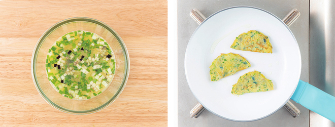 ④ 기름 두른 팬에 반죽을 지름이 10cm 되는 타원형 모양으로 올리고, 반쯤 익으면 접어 납작만두 모양을 만든다.