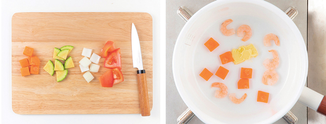 ② 새우살은 데치고, 토마토는 칼집을 내어 데친 후 껍질을 벗긴다.
