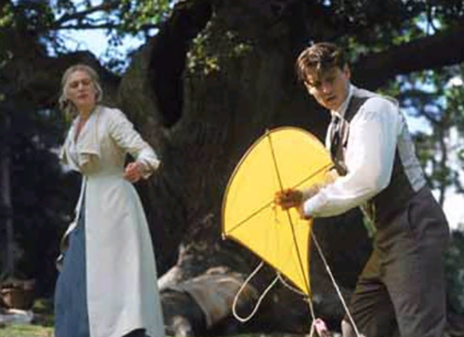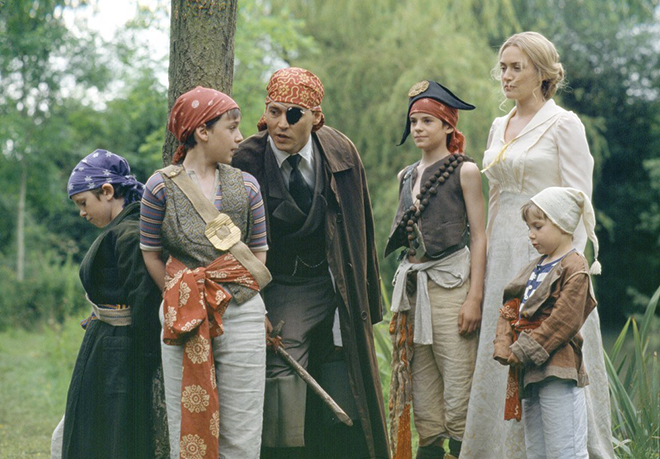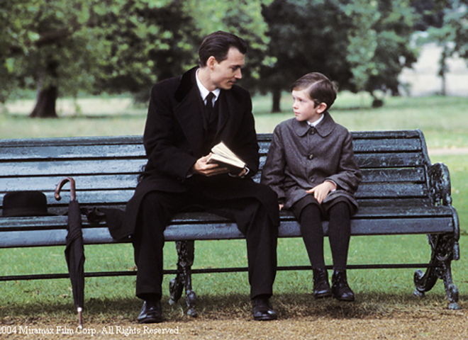 작가 제임스 베리(조니 뎁)는 이번에 올린 작품이 지지부진하자 슬럼프에 빠지기 시작합니다. 언제나 그렇듯 그는 산책을 나와 벤치에서 글을 쓰고 있는데, 공원에서 젊은 미망인 실비아(케이트 윈슬렛)와 그녀의 아이들을 만나게 됩니다. 아이가 없던 제임스는 이 활달한 아이들에게 관심을 두게 되고 자주 어울리게 되는데요, 제임스는 그 아이들이 침대에서 뛰노는 모습에서 창문 밖으로 날아가는 장면을 떠올리게 됩니다. 제임스는 즐거운 상상을 하면 아이들이 날 수 있다는 설정을 덧붙여, 이후에 ‘피터팬’의 명장면으로 탄생시켰지요.