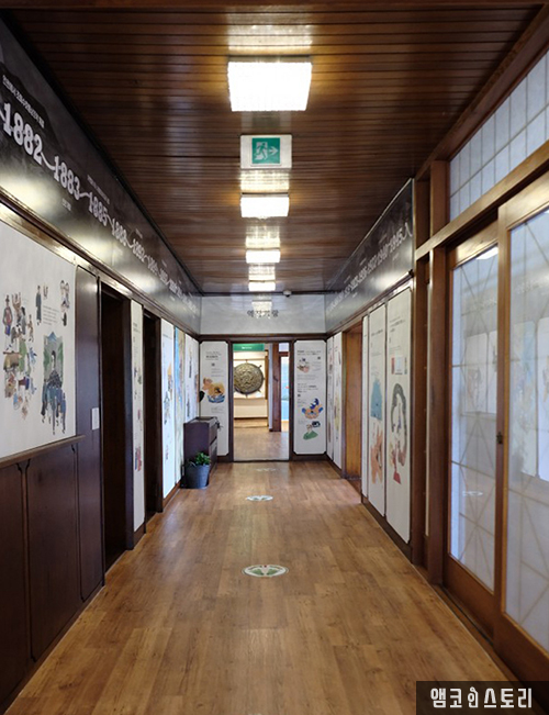 본관동을 입장하자 넓은 마루를 만납니다. 사방의 투명한 창으로 비추는 햇살이 참으로 따사로운 공간은 긴 복도를 사이에 두고 양쪽으로 이어지는데요, 인천 역사에 관한 다양한 책이 비치된 이곳은 방문객을 위한 ‘역사북쉼터’로 운영 중입니다. 그리고 양쪽의 역사북쉼터를 잇는 복도 공간은 ‘역사화랑’ 코너로 운영되고 있는데요, 최초의 태극기를 디자인한 역관 이응준, 대한제국의 비밀외교 공간을 설계한 러시아 청년 세레딘 시바찐, 청년 김창수를 백범 김구로 만든 강화 사람 김주경 등등, 인천의 다양한 역사 이야기를 그림과 함께 전시해 재밌는 볼거리를 선사합니다.