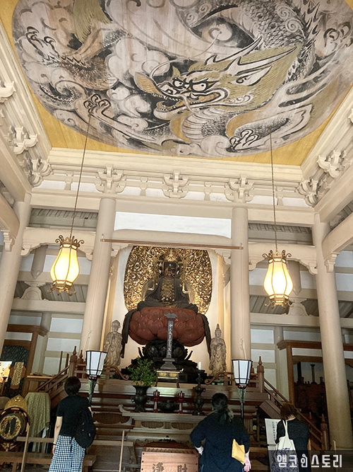 산문을 통해 엔가구지의 본존을 모시고 있는 불전으로 들어가면, 관을 쓰고 앉은 보관석가여래상을 가운데로 천정에는 백룡이 웅장하게 그려져 있으며, 오른쪽에는 붓글씨로 불심(佛心)이라고 크게 쓰여 있는 병풍이 놓여 있어 절만의 특유의 정적을 느낄 수 있습니다. 이 본당은 원각사에서 아침마다 좌선이 열리는 곳이라고 하는군요.