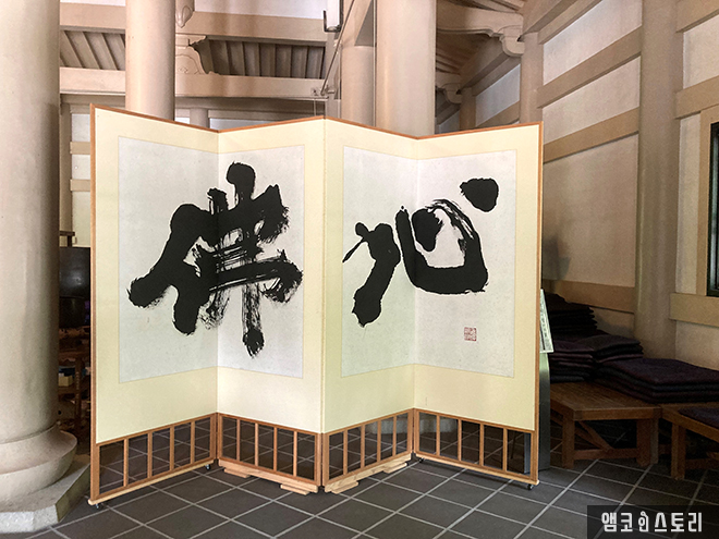 산문을 통해 엔가구지의 본존을 모시고 있는 불전으로 들어가면, 관을 쓰고 앉은 보관석가여래상을 가운데로 천정에는 백룡이 웅장하게 그려져 있으며, 오른쪽에는 붓글씨로 불심(佛心)이라고 크게 쓰여 있는 병풍이 놓여 있어 절만의 특유의 정적을 느낄 수 있습니다. 이 본당은 원각사에서 아침마다 좌선이 열리는 곳이라고 하는군요.