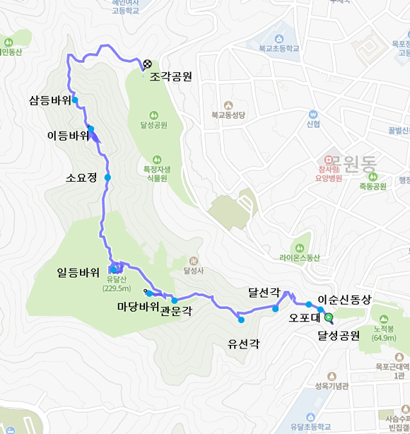 전체적으로 유달산 등산로는 정비가 잘 되어있어 편한 운동화로도 어렵지 않게 즐길 수 있고, 곳곳에 팔각정이 많아 쉬어 가기도 좋습니다. 근처에 높은 산이 없고 숲이 우거지지 않은 탁 트인 능선길이라, 조망이 아주 좋은 곳이라 가족들과 함께 방문하기도 좋은 곳입니다.