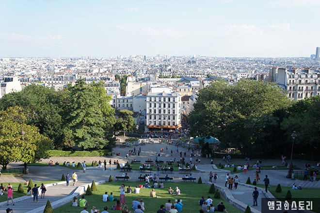 샤크레쾨르 성당을 둘러본 후, 우리 가족도 저 아래 푸른 잔디밭에 앉아 한참 동안 파리 시내를 내려다보다가 아래로 내려오려 하는데 그때 무리 지은 이들이 나타났다. 이번에는 팔찌가 아닌 맥주를 팔고 있었고 다행히 우리 쪽으로는 오지 않았다. 휴~! 가슴을 쓸어내리고 아래로 내려간다.