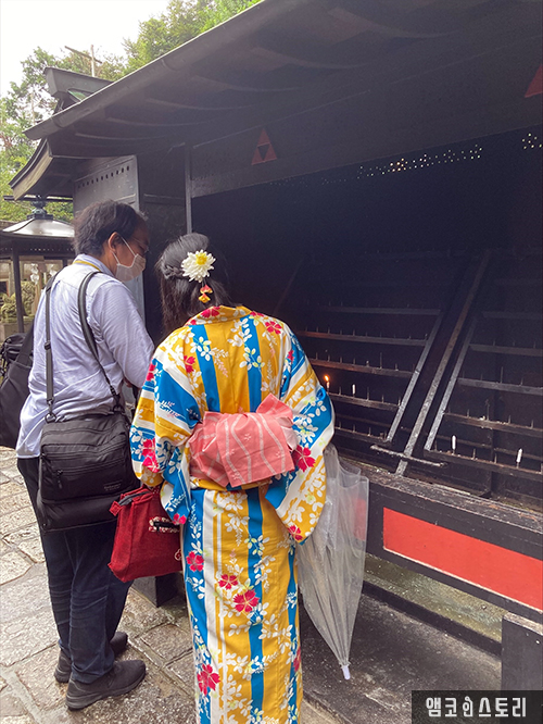 돌 터널과 도리문를 지나 끝에 있는 데미즈야에서 손을 씻어 자신을 깨끗하게 하고 나서 사무소에서 공양의 향과 초를 산다.