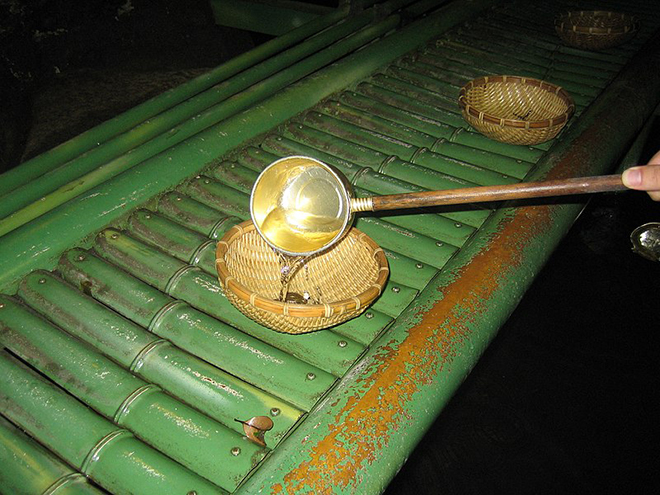 동굴로 가서 오궁에서 참배한다. 그 후, 빌린 바구니에 돈을 넣고 국자로 석 잔 정도 물을 뿌려 깨끗하게 한다. 또한, 씻은 돈은 ‘사용하는 사람’, ‘사용하지 않는 사람’으로 나뉜다. 그러나 사용하는 것이 은혜를 받는다고 알려져 있다.