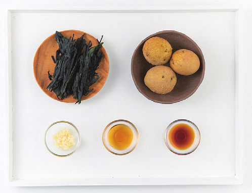 건미역(마른미역) 1.5g, 감자 40g, 다진마늘 1g, 참기름 1g, 국간장(조선간장) 2g, 물 300mL