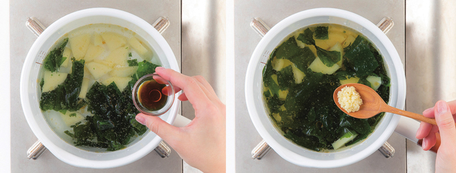 ⑥ 다진 마늘을 넣고 한소끔 더 끓여 완성한다.