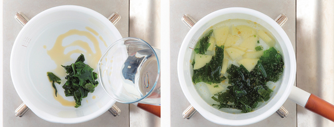 ③ 냄비에 참기름을 두르고 미역을 볶다가 물을 부어 끓인다.