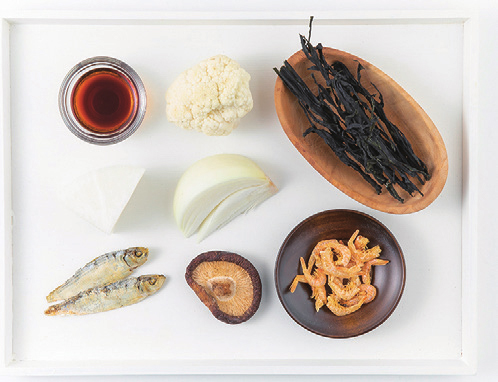 콜리플라워 25g, 건미역 2g, 물 500mL, 디포리(밴댕이) 2g, 양파 20g, 무 20g, 저염간장 1g, 건표고버섯 3g, 건새우 3g, 물 300mL
