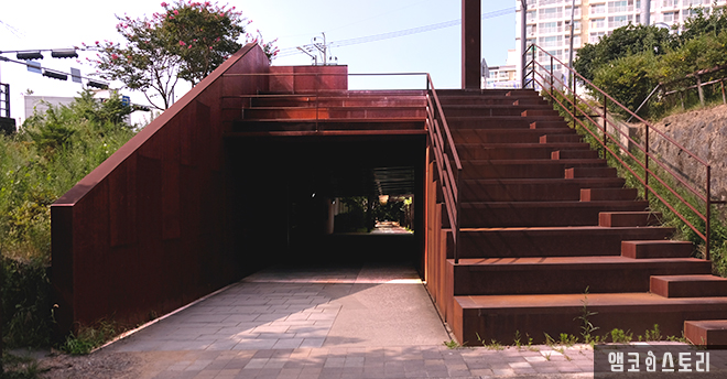 거대한 철골 구조물이 서서히 부식되어 전체적으로 붉은 기운을 품고 있습니다. 광주 동구 동명동, 그곳의 노상 공영 주차장에 설치된 ‘푸른길 문화샘터(승효상)’는 사라진 역사를 복원하는 광주폴리 I의 작품 중 하나로 인근의 푸른길 ‘농장다리’를 기억하고 있습니다. 100년 전, 광주감옥 제소자들이 노역을 위해 농장을 오가며 지나던 다리는 지금은 흔적마저 사라지고 없지만, 그 기억만큼은 어렴풋이 남아 이렇듯 훌륭한 추억의 장소로 조성되었네요. 여담으로 농장다리는 당시 모범수만 이용이 가능했던 다리로 주변 동네로 내려가는 계단은 현재 주민들의 작은 집회 장소로 쓰이며, 다리 밑 공간도 거리의 전시기능을 수행하고 있습니다.