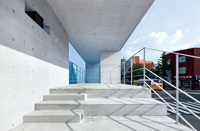 ‘광주폴리 I’은 ‘푸른길 문화샘터(승효상)’ 외 ‘소통의 오두막(후안 헤레로스)’, ‘잠망경과 정자(요시하루 츠카모토)’, ‘광주 사랑방(프란시스코 사닌)’, ‘열린 공간(도미니크 페로)’ 등등, 총 11개의 작품이 광주 도심 곳곳에 흩어져 있습니다. 국립아시아문화전당 어린이 문화원 앞에 자리한 ‘광주 사랑방(프란시스코 사닌)’은 회색의 노출 콘크리트 구조물이 눈에 띄는데요, 과거와 현재가 만나는 시간의 경계 위에 서 있는 설치물은 구시가지에서 아시아문화전당을 바라볼 수 있도록 디자인되었으며, 두 세계가 만나는 접점으로 존재합니다. 또한 간단한 계단이 있는 구조는 버스 정류장의 기능을 수행하며 동시에 시민들의 쉼터이자 전망대, 그리고 다양한 공연과 문화 이벤트가 유연하게 이루어지는 공공공간으로 기능하고 있습니다.