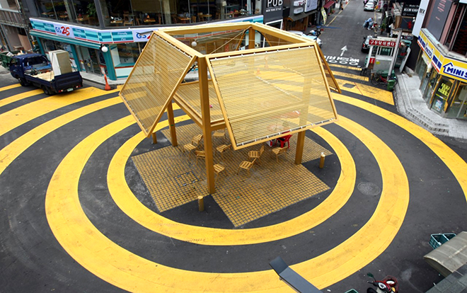 원색의 노랑이 눈길을 사로잡는 구조물은 프랑스 건축가 도미니크 페로의 ‘열린 공간’입니다. 광주 서남동 도로 한가운데에 자리한 폴리, 이곳은 1973년 이전 광주의 구시청이 있었던 곳으로 현재는 젊은 층의 유동인구가 많은 주요 상업지구 중 한 곳입니다. 작가는 이 사거리에 지역 주민들의 다양한 활동을 끌어낼 열린 공간으로서의 폴리를 제작했는데요, 전체적으로 포장마차 구조를 띠는 구조물은 한국 고전 건축물의 나무 기둥이나 누각, 처마에서 그 콘셉트를 가져왔습니다. 현대 상업지역과 그 거리 속 일상의 생기를 나타내기 위한 구조물, 지붕 아래에는 동일 색상의 의자가 마련되어 있어 오며 가며 쉬었다 가기 좋은 폴리입니다.