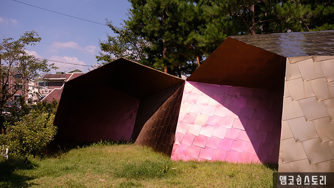 거대한 철골 구조물이 서서히 부식되어 전체적으로 붉은 기운을 품고 있습니다. 광주 동구 동명동, 그곳의 노상 공영 주차장에 설치된 ‘푸른길 문화샘터(승효상)’는 사라진 역사를 복원하는 광주폴리 I의 작품 중 하나로 인근의 푸른길 ‘농장다리’를 기억하고 있습니다. 100년 전, 광주감옥 제소자들이 노역을 위해 농장을 오가며 지나던 다리는 지금은 흔적마저 사라지고 없지만, 그 기억만큼은 어렴풋이 남아 이렇듯 훌륭한 추억의 장소로 조성되었네요. 여담으로 농장다리는 당시 모범수만 이용이 가능했던 다리로 주변 동네로 내려가는 계단은 현재 주민들의 작은 집회 장소로 쓰이며, 다리 밑 공간도 거리의 전시기능을 수행하고 있습니다.