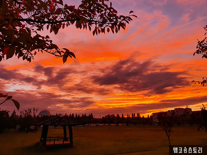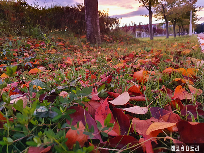 작열하던 여름의 햇살을 머금은 나뭇잎이 어느덧 낙엽 되어 회사 잔디밭에 하나둘 떨어지는데, 그 뒤편으로 붉은색 낙조가 뉘엿뉘엿 서산으로 넘어갑니다. 이렇게 여름과 가을이 바통터치를 하나 봅니다.