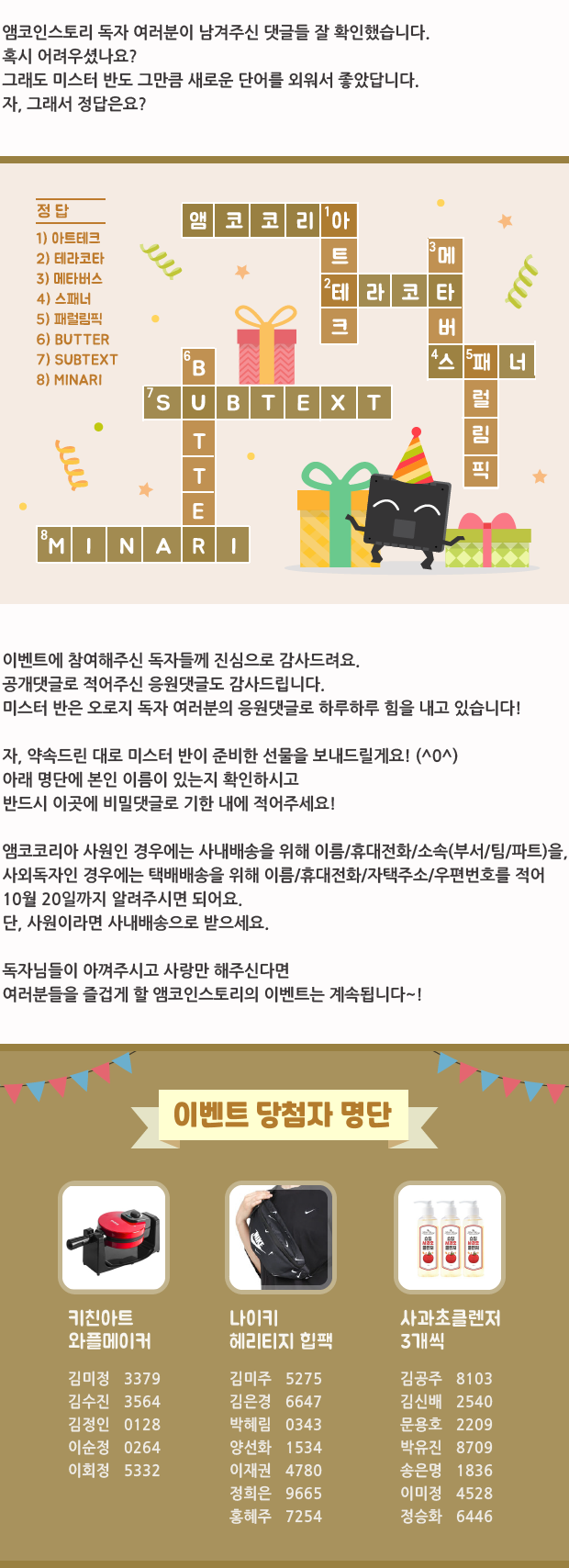 | 웹진 [앰코인스토리] 미스터 반과 함께 시원한 바다로~! 숨은그림찾기 이벤트 결과 발표 (38) | 2021.08.25 |