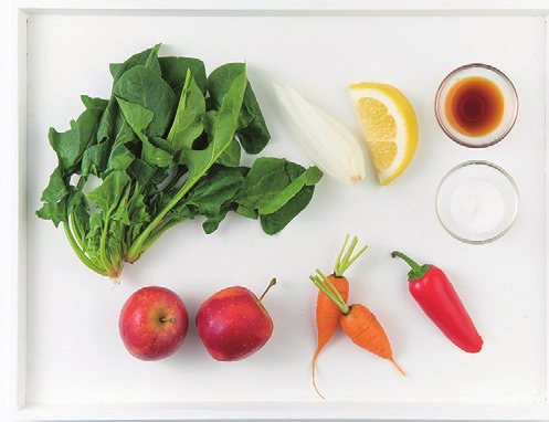 포항초 20g, 사과 5g, 당근 2g, 양파 2g, 파프리카 1g, 레몬즙(또는 식초) 0.2g, 저염 간장 0.4g, 설탕 0.2g