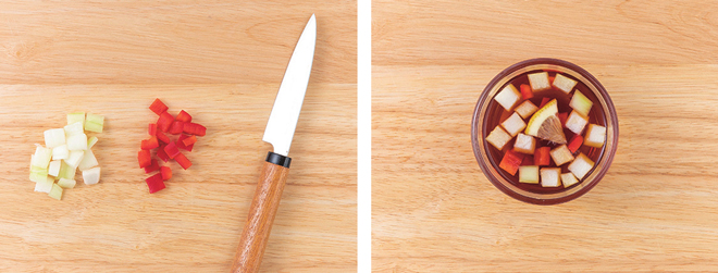 ③ 양파와 파프리카는 작은 큐브 모양으로 썬다.