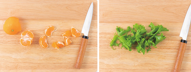 ① 감귤은 껍질을 제거하고 알을 분리하여 반을 가른다.