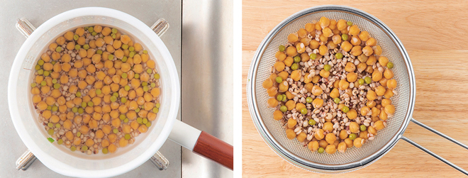 ③ 완두콩, 수수, 율무, 병아리콩은 하루 전에 물에 불린 후 삶는다.