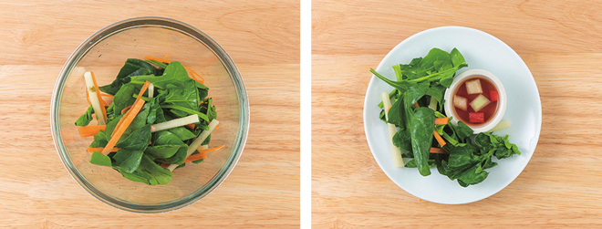 ⑤ 포항초에 당근과 사과를 넣어 섞는다.
