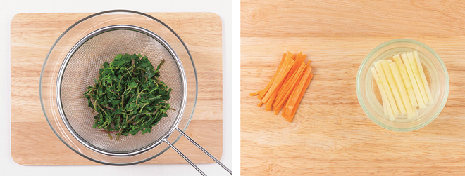 ② 당근은 얇게 채를 썰고, 사과는 껍질째로 채를 썰어 설탕물에 담근다.