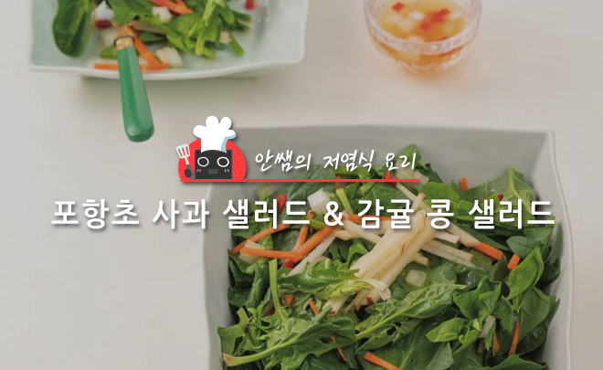 오늘 소개할 요리는 포항초와 사과를 넣은 포항초 사과 샐러드와, 병아리콩과 감귤이 들어간 감귤 콩 샐러드입니다. 각 요리의 저염 방법을 살펴보면, 포항초 사과 샐러드는 해풍의 영향으로 적당한 염분이 함유된 포항초에 사과를 곁들여 맛을 냈고, 감귤 콩 샐러드는 콩의 고소한 맛과 감귤의 단맛, 신맛으로 나트륨 사용을 줄였습니다.