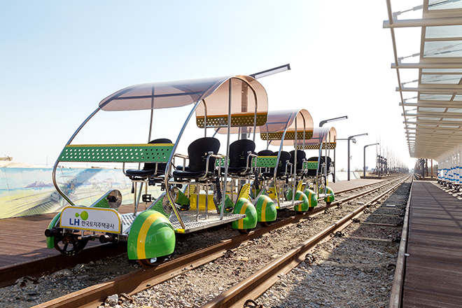 바닷길을 내려가 한가로이 갯벌을 거닐어 봅니다. 멀리 태평루 전각이 아득한데요, 저녁 무렵 물 빠진 바다의 속내 또한 이질감으로 다가와 뜻밖의 재미를 선사합니다. 둘레길을 따라 10분 정도 천천히 걷자 만나게 되는 재미는 영종진 공원의 하이라이트라 할 수 있는 ‘레일바이크(RAIL BIKE)’입니다. 무인발매기를 통해 발권 가능하며 요금은 2인승 25,000원, 3인승 29,000원, 4인승 32,000원이며, 운영 시간은 하절기(3~10월) 오전 9시부터 오후 6시까지, 동절기(11~2월) 오전 10시부터 오후 5시까지(연중무휴)입니다. 사전 온라인 예매도 가능하지만, 당일은 현장 발권만 진행된다는 점을 참고하세요. 동거가족의 경우 증빙서류 지참은 필수라고 하네요.
