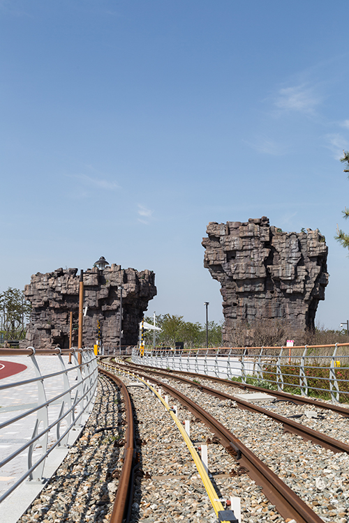 망망대해를 옆에 두고 십일 자 레일 길이 쭉 뻗어 있습니다. 시원한 바닷바람을 맞으며 바라보는 풍경은 더없이 상쾌한데요, 수동 페달은 생각보다 체력이 요구되기에 바이크 탑승 시 편한 복장과 신발을 추천합니다. 하늘 아래 마찬가지로 광활한 바다를 지척에 두며 달리는 레일 길, 멋스럽게 조성된 인공 폭포 사이를 지나고 저 멀리 우리나라에서 가장 긴 다리인 인천대교도 보이네요. 코스의 끝은 그 시작점과 동일합니다. 이용객이 안전하게 하차하면 직원이 방향을 돌려 다음 승객들을 태워 출발하는 시스템이군요. 깊어가는 가을, 영종도 레일바이크와 함께 시원한 바람에서 만끽해보아요.