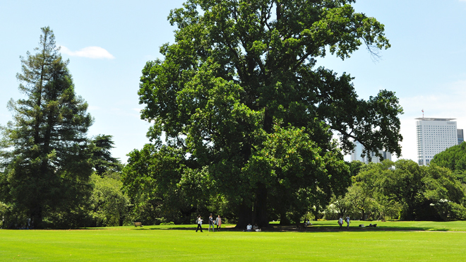 느긋하게 펼쳐진 잔디와 자연 그대로 느긋하게 자란 거목이 특징인 정원입니다. 신주쿠문에서 정형식 정원에 똑바로 뻗은 전망 선(비스타 라인)의 중앙에는 교엔의 심볼 트리 높이 30m를 넘는 튤립나무가 높게 우뚝 솟아 있습니다.