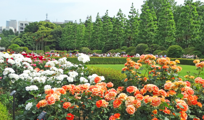 110개 종류, 500그루의 특색 넘치는 꽃들이 활짝 피는 장미 화단을 중심으로 좌우 대칭으로 합계 약 160개의 플라타너스를 4열의 가로수로 디자인한 정원입니다.