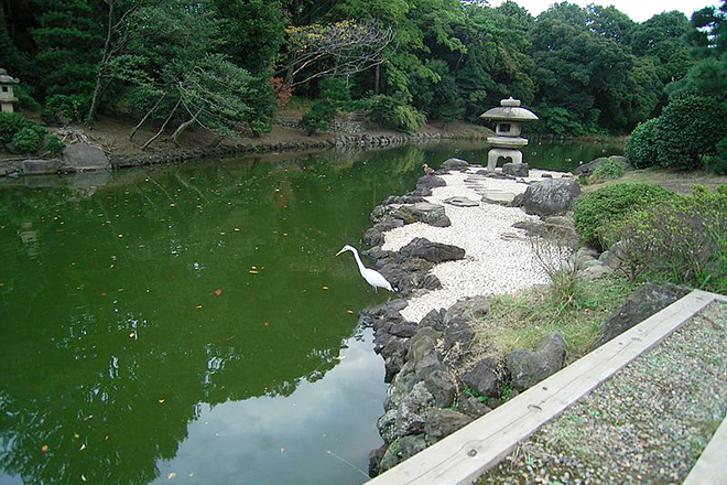 완만한 연못의 흐름에 따라가는 지천회유식 정원입니다. 옛날에는 오리장으로 만들어 쇼와 시작 무렵 일본 정원으로 개조되었습니다. 11월에는 황실 연고의 국화 화단 전시회가 개최됩니다.