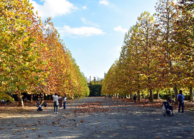 느긋하게 펼쳐진 잔디와 자연 그대로 느긋하게 자란 거목이 특징인 정원입니다. 신주쿠문에서 정형식 정원에 똑바로 뻗은 전망 선(비스타 라인)의 중앙에는 교엔의 심볼 트리 높이 30m를 넘는 튤립나무가 높게 우뚝 솟아 있습니다.