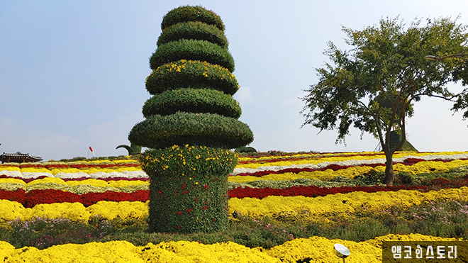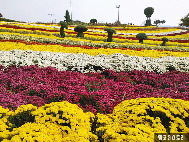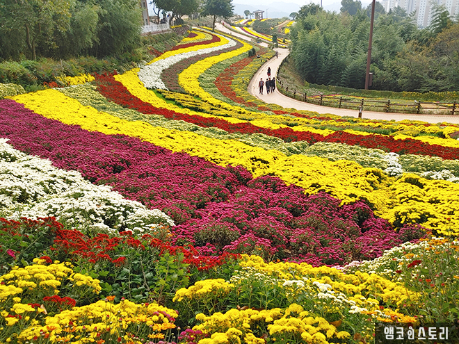 국화의 꽃말과 향기를 음미하며 가을 국화의 정취를 화순 남산공원에서 만끽한다. 눈부시게 깔끔하게 핀 국화, 가을 햇살 아래 아름답게 핀 국화. 노랑, 분홍, 빨강, 보라, 하얀색 색색깔로 뽐낸 국화꽃이 만개했다. 국화꽃을 바라보는 것만으로 행복하고 휘황찬란하게 눈부신 색깔의 국화 사이를 걸어 다니는 것만으로도 힐링이 된다.
