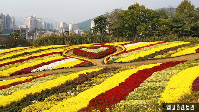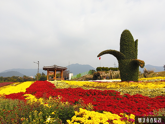 국화의 꽃말과 향기를 음미하며 가을 국화의 정취를 화순 남산공원에서 만끽한다. 눈부시게 깔끔하게 핀 국화, 가을 햇살 아래 아름답게 핀 국화. 노랑, 분홍, 빨강, 보라, 하얀색 색색깔로 뽐낸 국화꽃이 만개했다. 국화꽃을 바라보는 것만으로 행복하고 휘황찬란하게 눈부신 색깔의 국화 사이를 걸어 다니는 것만으로도 힐링이 된다.