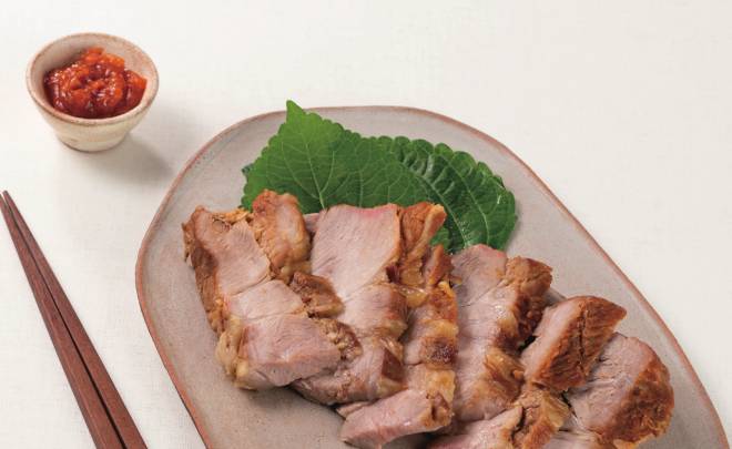 ⑤ ④에 숙성시킨 돼지고기를 올려, 약 0.5cm 두께로 썬다. 50분 정도 가열해 완전히 익혀준다.