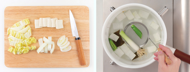 ① 배추, 양파, 두부는 한입 크기로 썰고 대파와 청양고추는 어슷썰어 준비한다.