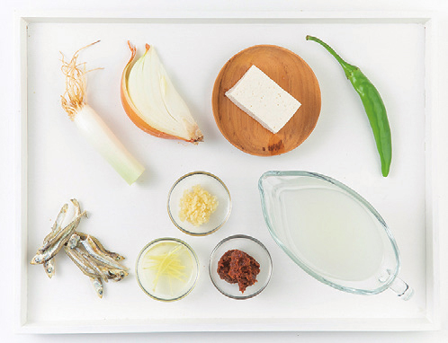 배추 15g, 두부 23g, 양파 15g, 대파 8g, 다시 멸치 4g, 청양고추 1g, 다진 마늘 0.5g, 생강즙 0.5g, 된장 2g, 쌀뜨물 46mL, 물 230mL