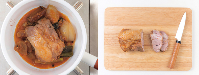 ⑤ ④에 숙성시킨 돼지고기를 올려, 약 0.5cm 두께로 썬다. 50분 정도 가열해 완전히 익혀준다.