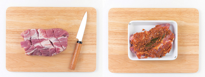 ① 돼지고기 앞다릿살에 칼집을 낸다.