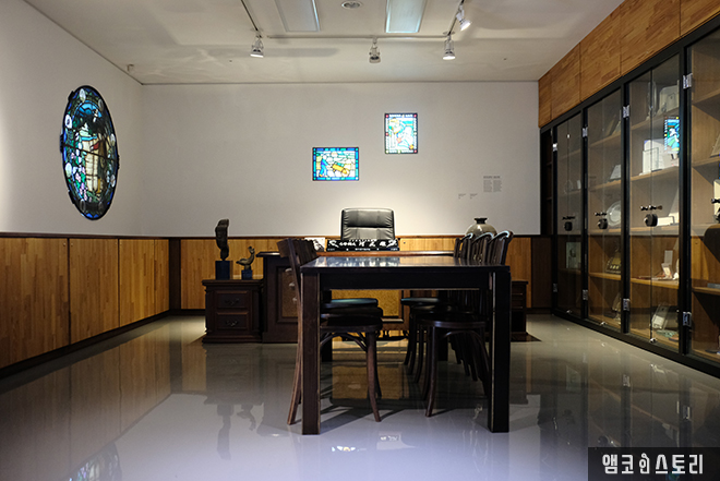 하정웅 미술관은 ‘기도의 미술’로 불리는 하정웅컬렉션을 활용한 소장품 전시 및 다양한 기획전을 개최하고 있습니다. 1993년부터 현재까지 그가 기증한 작품만도 약 2천500여 점에 달한다고 해요. 가격만도 최소 500억 원에서 1천억 원대에 이를 것으로 추산된다니, 실로 어마어마합니다. 기증작을 살펴봐도 이우환, 전화황, 곽인식, 최승희 사진, 샤갈, 피카소, 앤디 워홀 등등, 면면이 화려합니다. 특히, 하정웅컬렉션은 특정한 수집 방향을 가지고 고유의 성격을 형성해냈다는 점에서 그 가치가 있는데요, 디아스포라, 인권과 평화로 집약되는 그의 컬렉션과 민주·인권·평화라는 광주 정체성의 만남이 이곳 하정웅 미술관이 아닐까 싶네요. 2개 층의 미술관은 총 다섯 개의 전시실이 있는데요, 현재 이곳에서는 제21회 하정웅 청년작가 초대전 <어떤 날, 어떤 이야기>가 전시 중(11월 28일)입니다. 그리고 2층, 한쪽에는 하정웅 님의 예술철학을 느낄 수 있는 컬렉션과 명예관장실이 자리하고 있답니다.