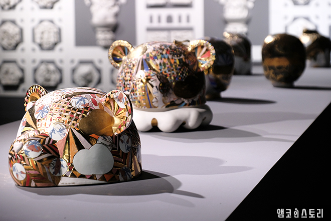 2층의 4전시실에서는 대전 출신 이윤희 작가의 도자 작품을 만나볼 수 있습니다. 문을 열자 묘한 느낌을 전하는 공간은 중세의 세계관을 집대성한 단테의 <신곡>을 모티브로 꾸민 도자의 세계입니다. 특히 흰색 베이스에 다채로운 색감이 정교하게 페인트된 소녀상이 신비로운 분위기를 전하는데요, 벽면에는 궁전 모양의 틀에 단테의 소녀상과 더불어 종교적 장면들을 부조로 재현하여 성서적 메시지를 전달, 작가만의 서사를 제시하고 있습니다.