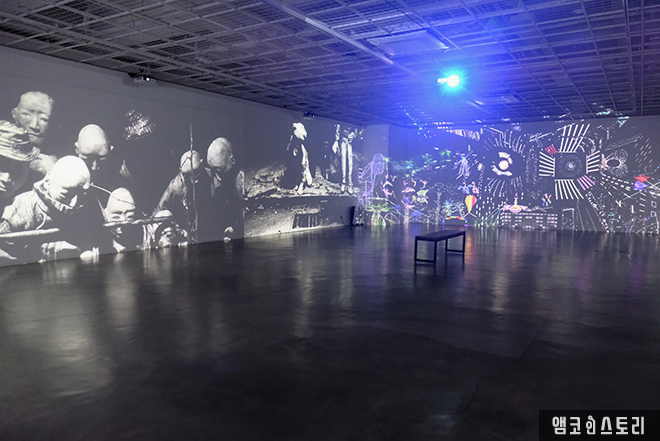 하정웅 명예관장의 메세나 정신과 청년작가 발굴육성의 뜻을 기리는 전시, <어떤 날, 어떤 이야기>에서는 문소현, 정정하, 이윤희, 문지영 이렇게 최종 네 명의 작가의 작품을 만나볼 수 있습니다. 작가들은 다른 지역에서 각각 다른 장르로 각자 자신들의 이야기를 작품 속에 담아내고 있는데요, 먼저 제1전시실의 문소현 작가(경기도)의 작품을 만나봅니다. 거대한 공간 속 광활한 어둠을 사방에서 둘러치는 미디어 아트 작품의 한가운데 서 있습니다. 정면에 보이는 는 네온사인으로 뒤덮인 온갖 인공적 화려함을 비추며 그 속에 생명력 없는 현대사회의 구조를 조명하며, 반대편 입구 쪽의 <터지는 폭죽들>은 빛이 나는 전기 살충기에 벌레들이 뛰어드는 모습을 통해 현대사회를 살아가는 우리들의 모습을 풍자하고 있습니다.