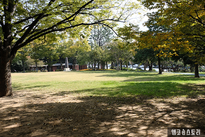 지하철 농성역에서 도보로 10분, ‘하정웅 미술관’은 상록회관 근처에 위치합니다. 미술관 초입, 입구를 따라 가을을 만끽할 수 있는 예쁜 산책로를 걷습니다. 이내 모습을 드러내는 미술관 건물은 고풍스러운 빨간 벽돌이 인상적입니다. 그 전신이 광주시립미술관의 분관이던 ‘상록전시관’이자 옛 전남도지사 공관이던 건물은 그 앞으로 넓은 잔디밭이 조성되어 있습니다. 나무와 벤치의 조화는 미술관 관람 전후로 유유자적한 시간을 보내기 더없이 좋을 듯합니다. 미술관 1층에도 휴식공간은 자리하는데요, ‘하늘정원’ 카페가 그것입니다. 카페 외부, 테라스 공간은 선선한 가을을 즐기기 좋아 보이는데요, 아쉽게도 현재 코로나로 운영이 중단된 상태라고 하네요.