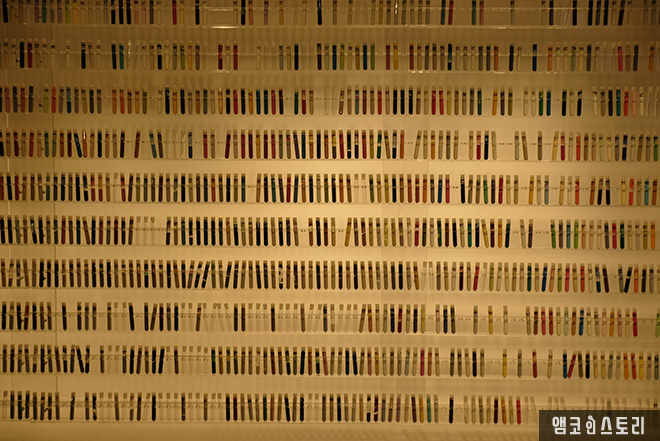 2전시실과 3전시실에서는 광주 출신의 정정하 작가를 만나 볼 수 있습니다. 전시실에 들어서자 벽면 가득 수많은 실험 병이 열을 맞춰 진열되어 있는데요, 각각의 병은 저마다의 색을 담고 있어 전체적으로 다채로운 색감을 연출하고 있습니다. ‘빛을 모으는 또 다른 방법’이라는 주제 아래 설치와 페인팅 등, 갖가지 방식으로 표현된 작가의 작품은 작가 자신이 만난 수많은 사람을 관찰하여 그 사람만의 특색을 특정 색감으로 정의, 빛의 이미지로 표현하고 있습니다. 둥근 틀 안에 여러 색상의 점은 사람들의 에너지를 나타내며, 제3전시실에서는 어두운 공간을 사람의 센서에 의해 다채로운 색감으로 물들이는 작품, <아름다운 두려움>을 만날 수 있습니다.