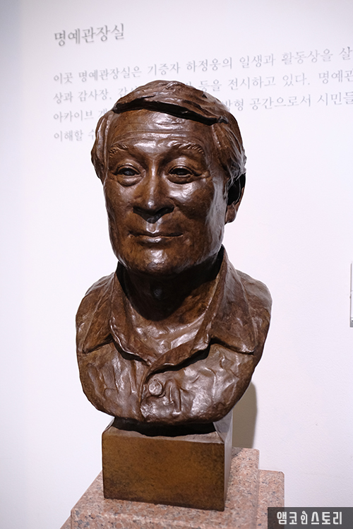 2층의 ‘숨, 공간’은 테이블과 화분 편안한 조명이 함께하는 장소입니다. 관람 중 몸과 마음을 잠시 쉬어가기 좋은데요, 이어진 발걸음이 한편에 마련된 하정웅 명예관장실을 향합니다. 그의 생애와 업적, 수상기록 등이 일목요연하게 전시되고 있는 공간에서 선생의 일대기를 살펴봅니다. 공간 안쪽, 외부로 연결되는 문을 열고 나서자 너른 야외 테라스가 선선한 가을바람을 선물합니다. 인적 드문 장소는 조용히 긴 휴식을 취하기 좋아 보입니다.