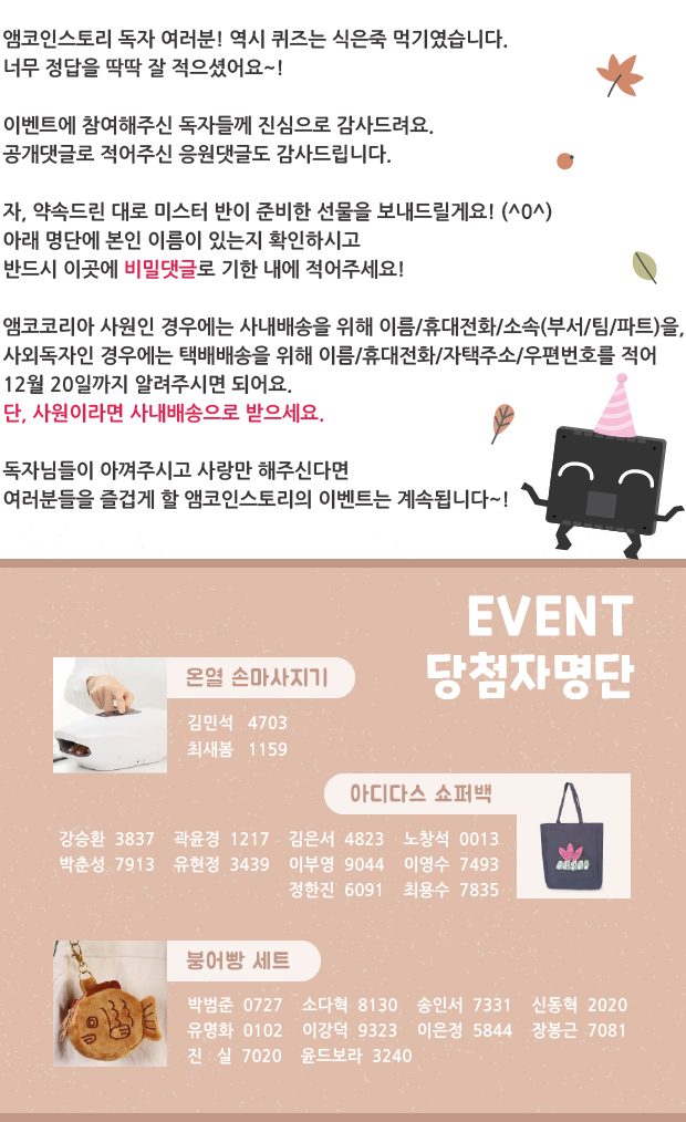 | 웹진 [앰코인스토리] 가을을 보내는 땡땡 퀴즈! 이벤트 (599) | 2021.11.02 |