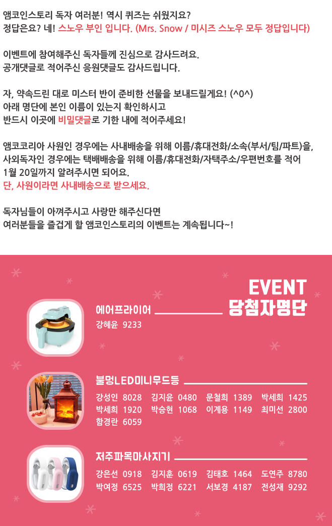 | 웹진 [앰코인스토리] 가을을 보내는땡땡 퀴즈 이벤트 결과 발표 (32) | 2021.11.25 |