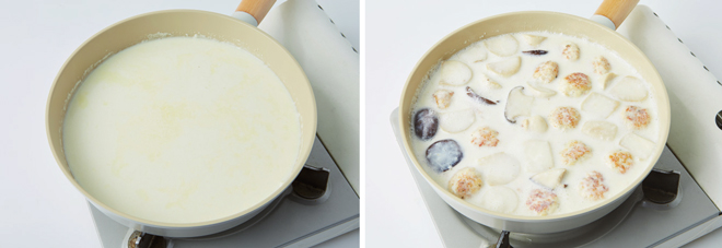 ⑤ 약한 불로 줄인 뒤 같은 팬에 버터와 밀가루를 넣고 3~5분간 볶아 블론드 루를 만들고 우유를 부은 뒤 10분간 끓인다.